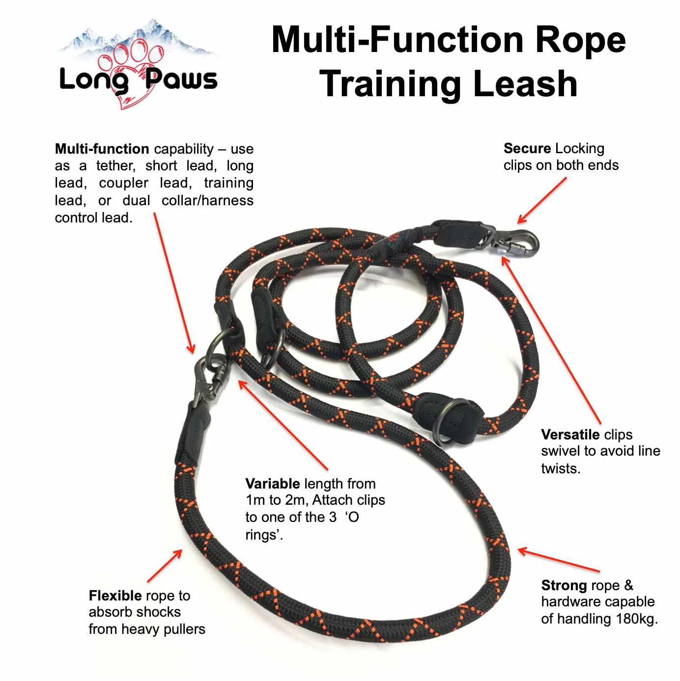 The Long Paws Multi-Function Training Lead is an all-in-one leash for you and your dog. The lead has clips on both ends, and a number of rings along the length of the lead. This lets you clip one end to your dog's collar / harness, and then adjust the length of the lead by clipping the other end to one of the rings.